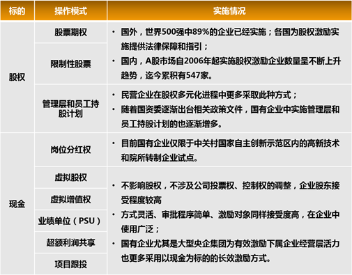 從國內外企業(yè)實施經驗來看,主要分為以股權或現(xiàn)金為標的的兩類激勵方式,常見的操作模式包括: